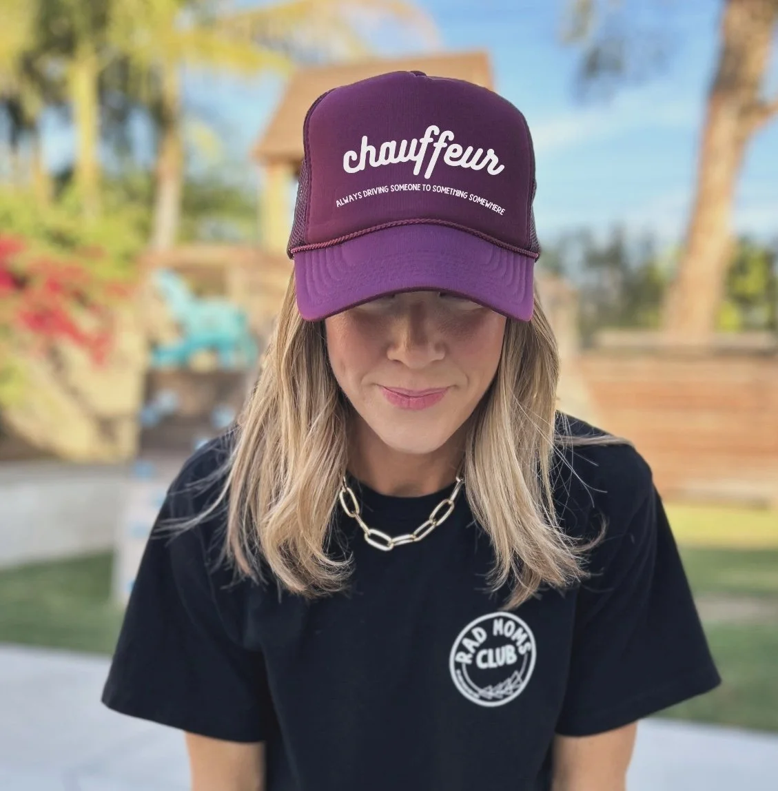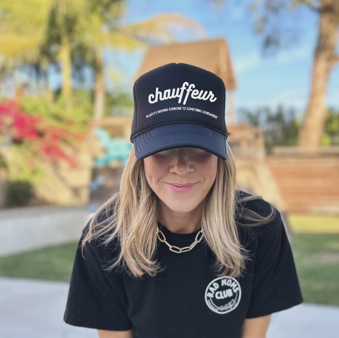 School drop off, pickup, play dates, sports games … Do you feel like you are “Always taking someone to something somewhere”? If so, 1. You’re a rad mom and 2. This chauffeur trucker is for YOU! Puff text for “chauffeur” and flat text for “always driving someone to something somewhere”.